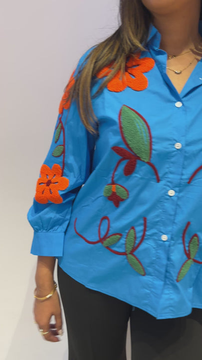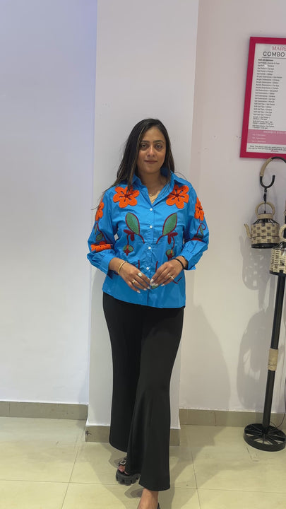 Vibrant blue shirt top with bold orange floral embroidery on the shoulders and sleeves. A stylish pick for both casual and semi-formal wear.