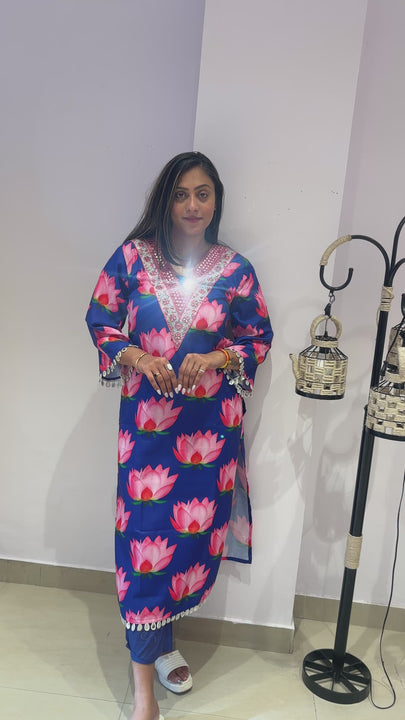 Elegant navy blue kurta featuring bold pink lotus floral prints and a beautifully embellished V-neckline. Accented with mirror work and lace details on the sleeves for a chic ethnic look. Perfect for festive gatherings, casual occasions, and everyday elegance.